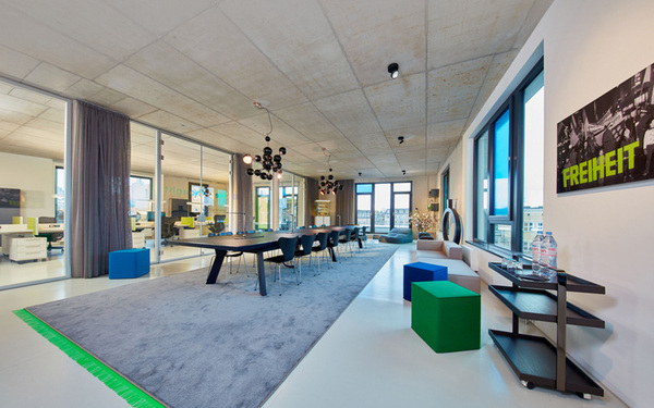 freiheit公司的文化精神通過(guò)室內(nèi)的裝飾材料和形式得以表達(dá)。組織團(tuán)隊(duì)的開(kāi)放辦公區(qū)裝點(diǎn)以超大型的木制工作臺(tái);這里配有生活廚房、大禮堂以及亮麗的創(chuàng)客空間,隨手涂寫的黑板墻、大型木制工作臺(tái)、甚至還有壁爐,公司的程序員都在這個(gè)頂層空間共同辦公、合作與休閑交流。