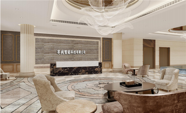 如某公司辦公室大廳設(shè)計(jì)以現(xiàn)代大氣為基調(diào),雙層挑高大廳以大理石拼接直通到頂,金屬色不銹鋼鑲嵌修飾,氣勢(shì)恢弘。