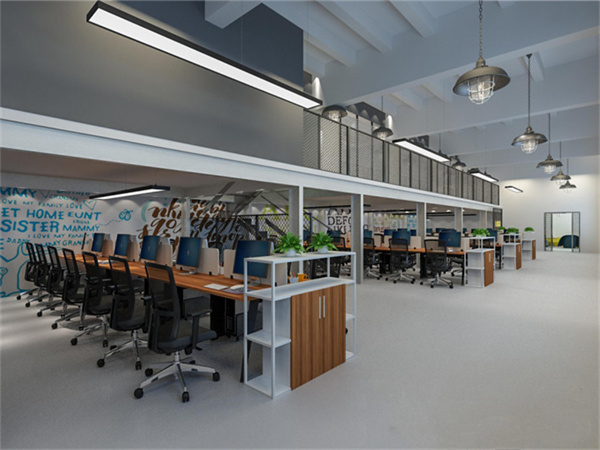 2、該創(chuàng)意園辦公室裝修案例主要以簡約工業(yè)化風格主,設計師運用光線的原理大面積使用玻璃隔斷,天花噴黑 地面油加固漆,使其整個辦公室更加通透、大氣且提高員工的舒適感。