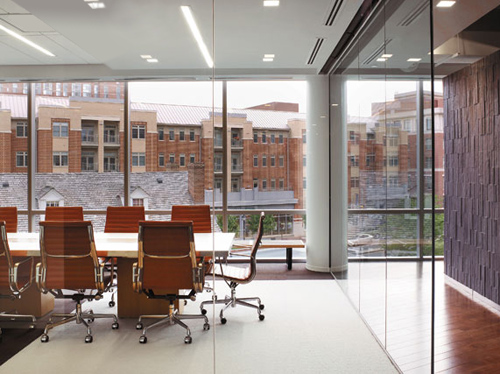 會(huì)議椅與定制的會(huì)議桌,會(huì)議桌面層為烤漆玻璃并嵌入條形白色橡木。