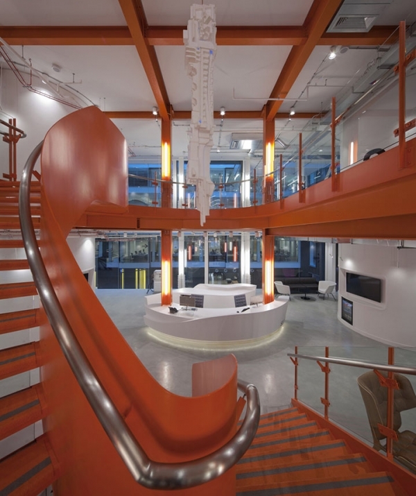 SEI總部辦公室裝修設(shè)計(jì)給人們帶來獨(dú)特的空間體驗(yàn),接待大廳一座定制的螺旋鋼樓梯和雕塑般的接待前臺。樓梯中間猶如宇宙飛船般的雕塑,是設(shè)計(jì)師嘗試用聚苯乙烯這種輕質(zhì)材料打造具有未來感的發(fā)光電塔.