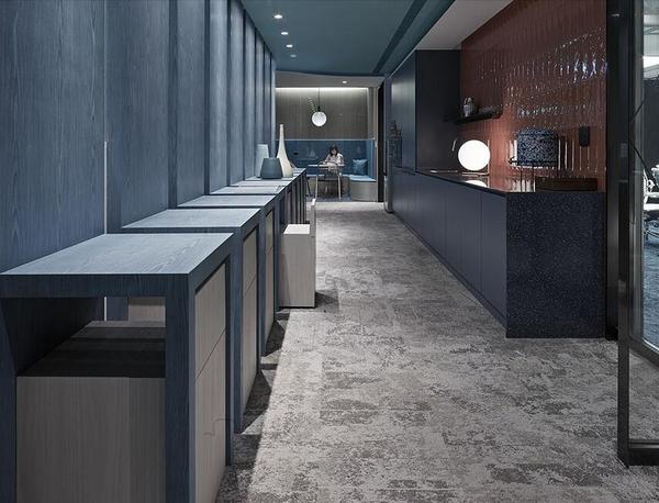 設(shè)計(jì)師萃取了中世紀(jì)文藝復(fù)興的紋理、石材,以及同時(shí)期繪制于宗教畫(huà)作的珍貴藍(lán)料元素,以含蓄的約略性質(zhì)展現(xiàn)時(shí)間洗刷的累積過(guò)程。整體空間以金色及藍(lán)色為視覺(jué)基調(diào),呼應(yīng)財(cái)富與威望、知識(shí)與信任的冀求,更于主廊道及茶水間設(shè)置木質(zhì)開(kāi)放式座椅提供閱讀、討論與休憩,讓室內(nèi)營(yíng)造出流動(dòng)性。