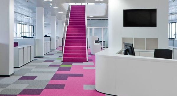 室內(nèi)中庭一條寬敞的洋紅色樓梯將上下貫穿在一起,開敞的空間促進員工間的交流與合作。洋紅、魅紫和新鮮的草綠地毯,將中庭空間裝扮的猶如美麗的調(diào)色盤,優(yōu)雅清新靚麗。