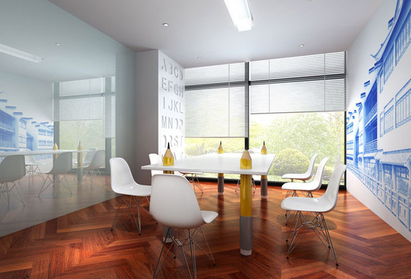 會議室的設計,設計師在設計的時候,以色彩鋪墊整個空間,以地圖對空間進行點綴,一則創(chuàng)意無限,二則說明思維的重要性。