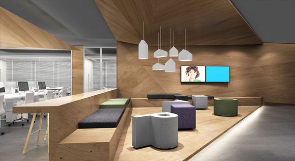 辦公區(qū)域的設計,設計師主要為了突出交流功能,以固定的工作位置來增強團隊合作的便利性。