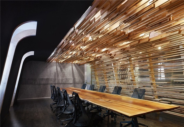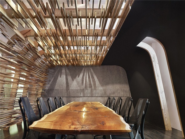 會(huì)議室的墻面由毛氈與黑板以及落葉松木條板組成,無序的條板構(gòu)造像是牛身體內(nèi)的經(jīng)脈??臻g結(jié)構(gòu)如同一艘小船或原始人居住的棚屋。