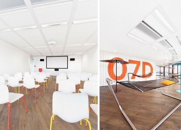 在Prague 辦公區(qū),我們會(huì)發(fā)現(xiàn)這里有一個(gè)私人的餐廳(其所需要的運(yùn)營成本,員工的花費(fèi)由公司負(fù)責(zé)),共設(shè)計(jì)有七層空間,修建了健身房、商店、錄音棚、游戲室、電影院、高爾夫球模擬器、圖書室、布置有吊床和遮陽傘的休息室。對于辦公區(qū)域而言,沒有標(biāo)準(zhǔn)化的建筑元素。