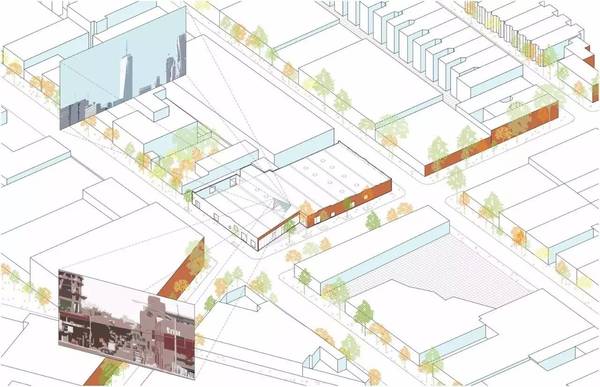 這樣的設(shè)計(jì)手法,給予室內(nèi)空間相互關(guān)聯(lián)。同時(shí),設(shè)計(jì)者還對(duì)建筑入口進(jìn)行了從視覺(jué)化的處理,移除面向西南角的三角形的區(qū)域,改為透明的立面,將被涂鴉的磚墻重新組裝,以制造出不同的涂鴉樣式,以此表現(xiàn)建筑以及社區(qū)間層層疊加以及穿插的歷史。