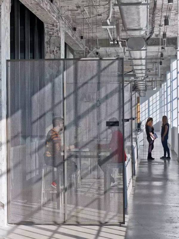 結(jié)構(gòu)柱和梁暴露在外,依然覆蓋著近乎一個(gè)世紀(jì)的涂料,*小程度的噴砂以防止剝落。表面和家具的靈感來(lái)自原始空間;自由形式盒子被包裹在膠合板和深灰色的板巖,椅子顏色從混凝土墻上采樣。設(shè)計(jì)師設(shè)計(jì)了一個(gè)穿孔金屬網(wǎng)系統(tǒng),以允許整個(gè)辦公室的開(kāi)放性和流動(dòng)性。
