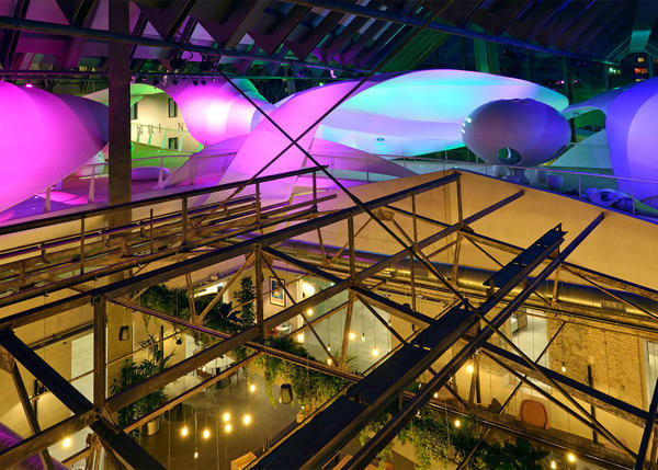 整個(gè)展區(qū)的中心的辦公室設(shè)計(jì)被一個(gè)巨型白色雕塑占據(jù),這個(gè)裝置本身也成為展覽的一條主要游覽路徑,可以連接到展區(qū)的各個(gè)位置。進(jìn)入夜晚后,在夜景主題的燈飾光照環(huán)境下,白色雕塑還會(huì)顯出漸變的彩色紋理,頗有些童話世界的味道。如果這樣的辦公室風(fēng)格設(shè)計(jì)出現(xiàn)在你的工作環(huán)境中,會(huì)不會(huì)樂(lè)不思家呢?