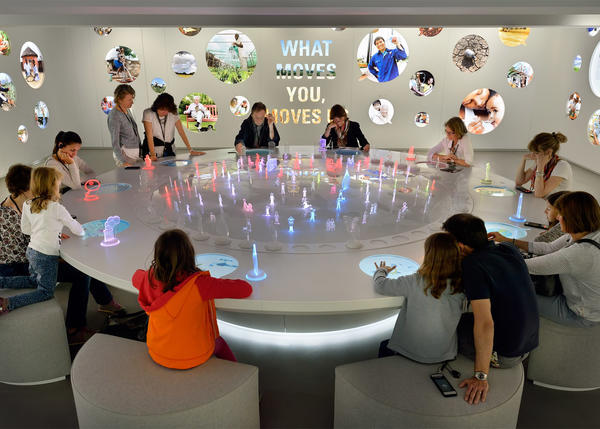 象征當(dāng)下的Forum部分,通過(guò)交互式裝置,讓觀者意識(shí)到營(yíng)養(yǎng)與健康行業(yè)的社會(huì)責(zé)任。象征未來(lái)的Visions部分,參觀者可以通過(guò)游戲和虛擬現(xiàn)實(shí)來(lái)體驗(yàn)科學(xué)家的熱情和他們創(chuàng)意十足的發(fā)明。在一次次的互動(dòng)體驗(yàn)后,參觀者可以通過(guò)此次展會(huì)場(chǎng)地的辦公室裝修與設(shè)計(jì)所傳達(dá)出的理念以及自己的感悟來(lái)體會(huì)這個(gè)企業(yè)關(guān)于過(guò)去、現(xiàn)在和未來(lái)的每一段旅程,感受著一百五十年的歷史所蘊(yùn)含的雀巢精神。