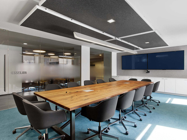 清朗凝練的空間更多了一份雍容典雅的都市氣質(zhì),依舊以藍(lán)色標(biāo)志色為裝飾主調(diào),只是這次的藍(lán)色更暗雅、更富于細(xì)膩的變化。極富質(zhì)感的白蠟?zāi)静馁|(zhì)與黑色碳鋼構(gòu)件制作的家具,呈現(xiàn)出特有的都市氣質(zhì)。閉合的洽談室和會(huì)議室大多聚集于空間的內(nèi)部,以盡可能留出沿窗的空間令視線不被遮擋。連續(xù)而開敞的玻璃窗,讓室外城市美景盡收眼底,心情也變得豁然開朗。