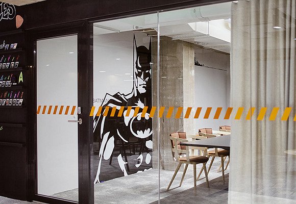 背景墻設(shè)計(jì)里有很多蝙蝠俠、綠巨人、超人等影視漫畫(huà)元素。