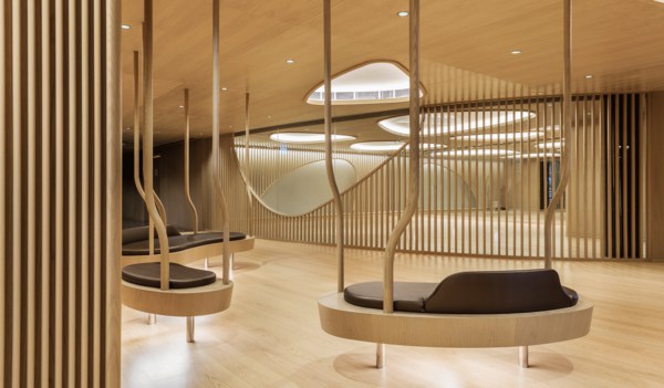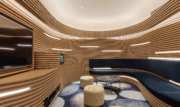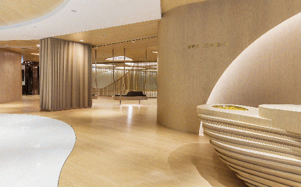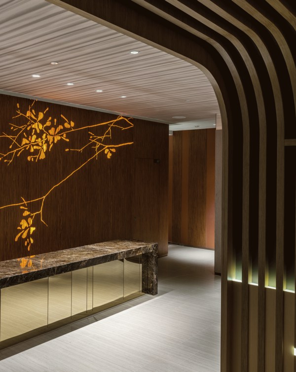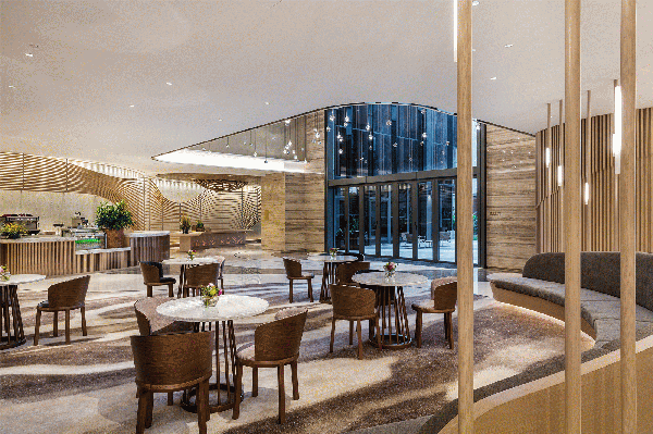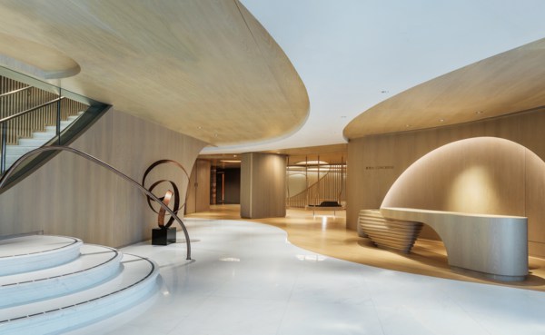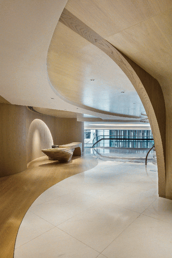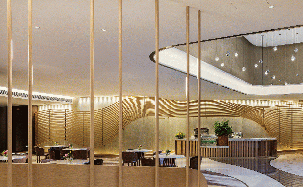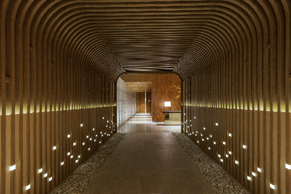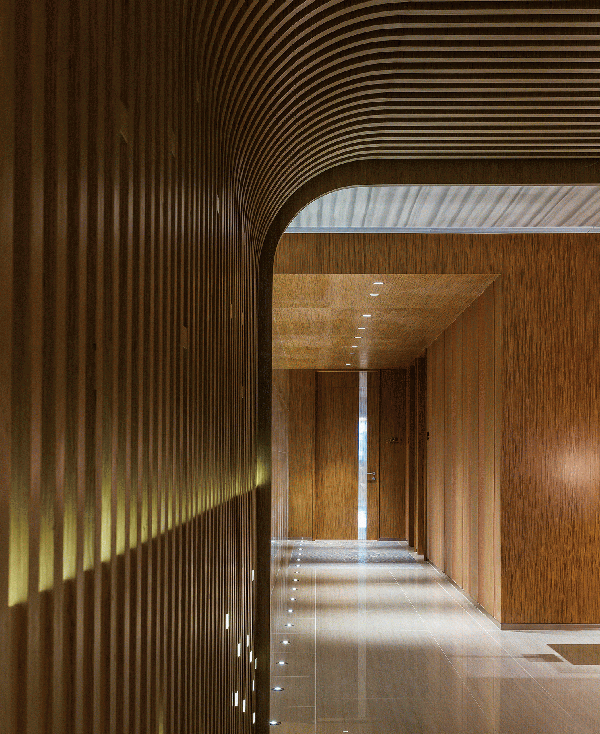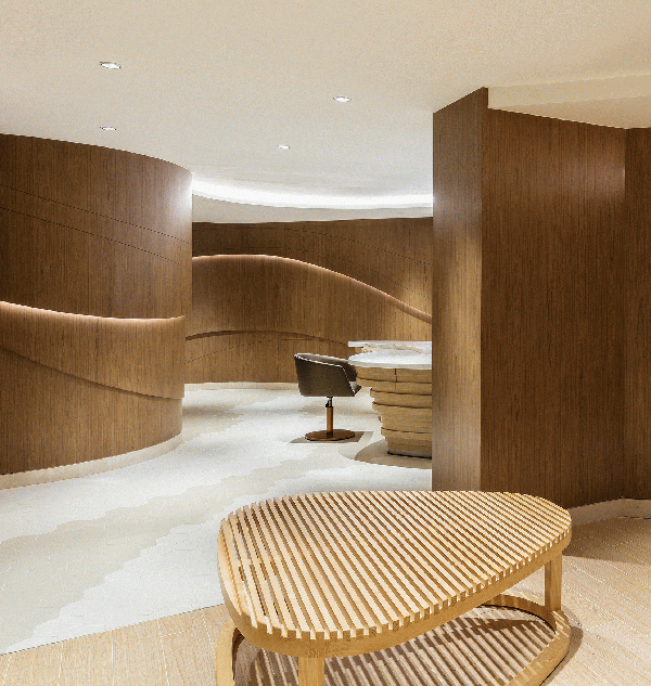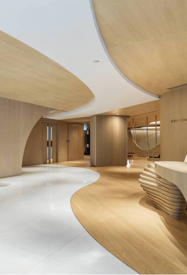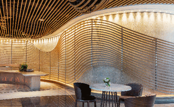 會所內(nèi)的木材不僅僅是結(jié)構(gòu)性的支持,起伏有致的輪廓劃分出不同區(qū)域,優(yōu)雅的弧線跨越寬敞的空間與柔和的燈光產(chǎn)生巧妙的相互作用。豐富的線條增強空間的立體感而不失悠閑的舒適享受,精妙的雕塑元素糅合簡約的燈光折射及滲光燈槽,整體干凈利落,構(gòu)筑出精美雅意而富藝術(shù)感的視覺效果,凸顯設計師細膩的設計考量。