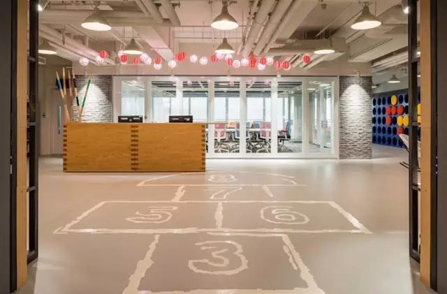 24,000平方英尺的辦公室共分為兩層。作為一家創(chuàng)意機構其自身的辦公室定要符合其品牌形象,進入電梯廳,一道游樂場式樣的大門緩緩打開,地面上繪制著小時候大家熟悉的跳房子游戲圖形,親切而有趣的視覺圖形將視線引入接待大廳,并穿透層層玻璃會議室,看向遙遠的海港。