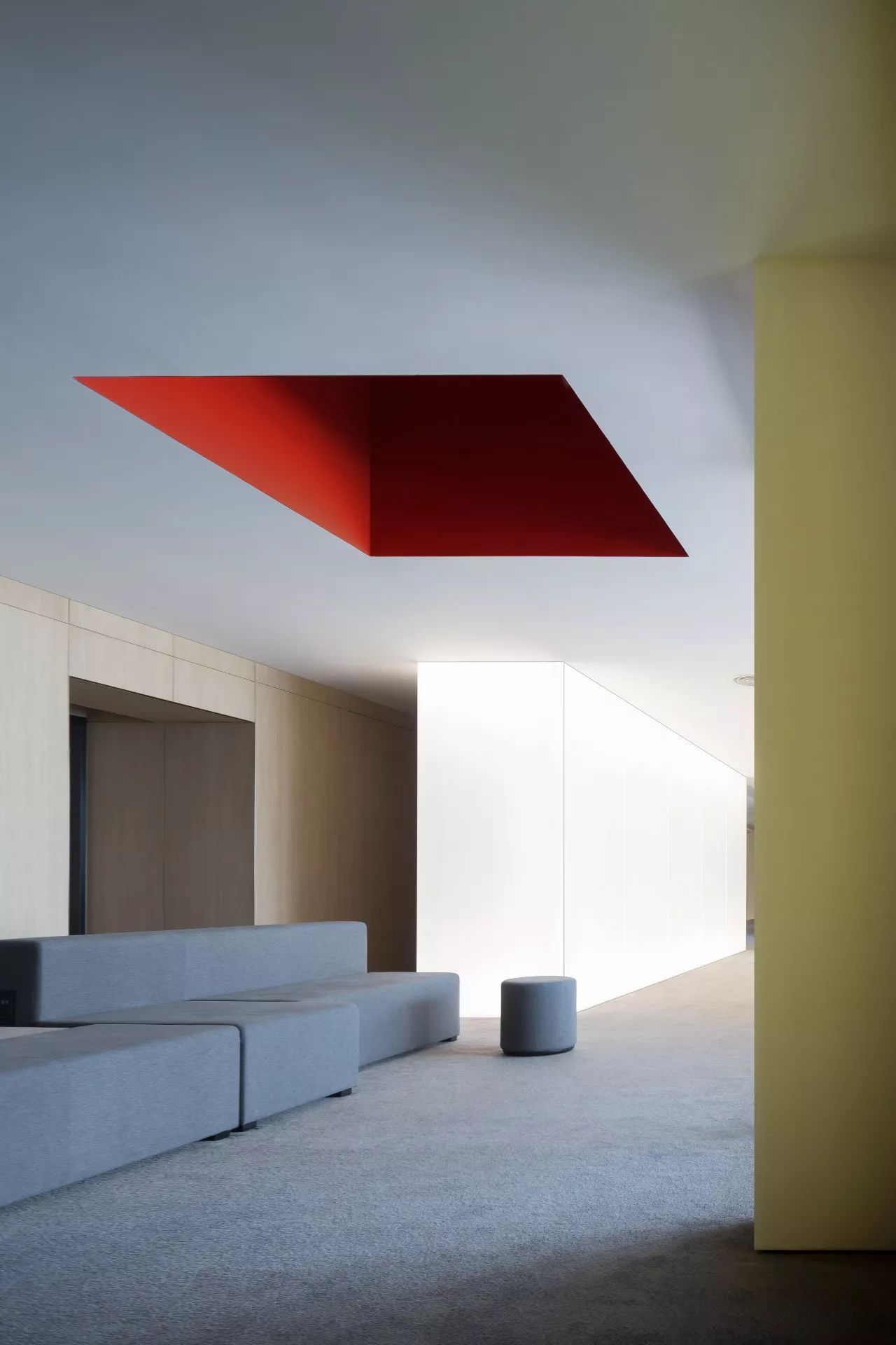 大廳天花頂部的開孔與立面的開孔相呼應(yīng),呈現(xiàn)豐富而有趣的空間構(gòu)成和層次的延伸感。
