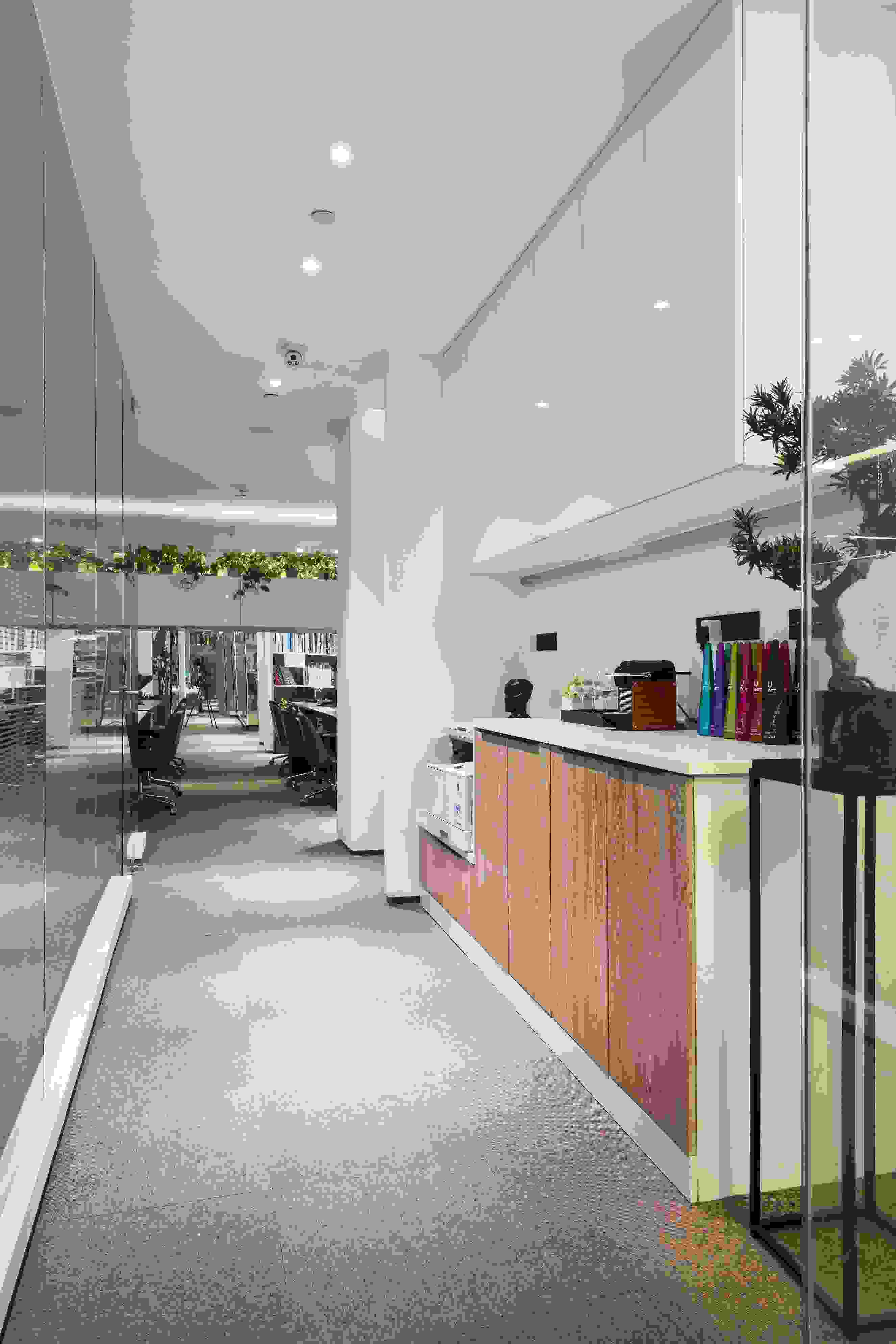 辦公室內(nèi)細(xì)膩出色的裝飾,遵從自然優(yōu)雅的原則,尊重原有空間的形態(tài),座椅和冰箱選用了跳脫的紅色,突出空間的視覺(jué)色彩。