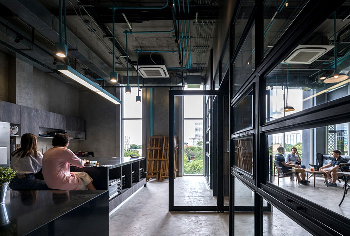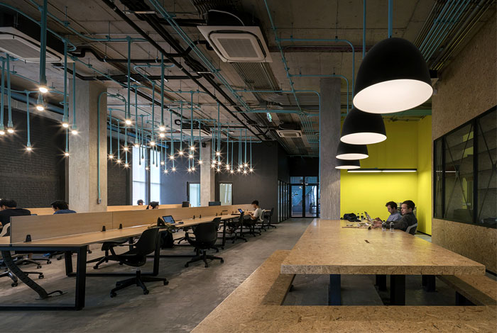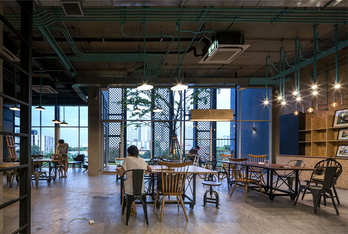 整個(gè) Co-Working Space 面積寬敞,以工業(yè)廠房的形式接待著來(lái)訪的客人,稍經(jīng)修飾的地面與裸露的混凝土立柱,帶來(lái)*為原始、粗獷的空間魅力,一層為咖啡廳,從售賣(mài)各種食品的吧臺(tái)到充滿工業(yè)感的桌椅,很難將它與工作空間聯(lián)想到一塊。