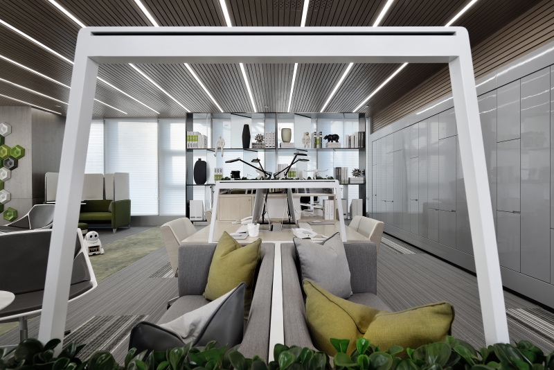 通過天花統(tǒng)一的木紋鋁板造型及燈帶的形式,迅速把空間整合起來。讓各種不同的辦公形式,在空間中都能很好的融合。吧臺工位、私人工位、互動工位、總裁工位等,不同的工作形式能為不同部門不同崗位的員工,提供多元化的工作需求,讓大家共聚一堂。