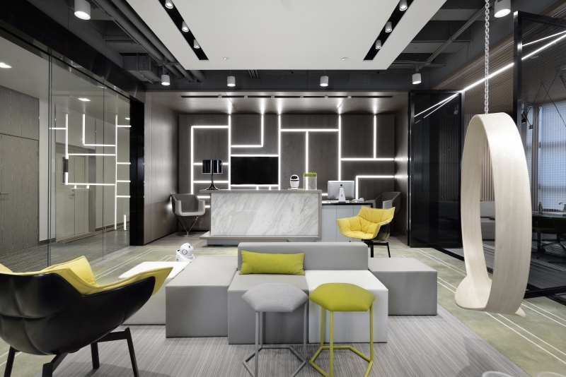 門廳區(qū)域摒棄傳統(tǒng)冷冰冰的接待形式,由超級吧臺、茶歇區(qū)、健康辦公區(qū)、討論區(qū)等功能組合而成,把互聯網開放性思維植入到日常辦公生活中。同時利用健康跑道地毯將整個空間串聯起來,讓空間更加具有活力和生氣。
