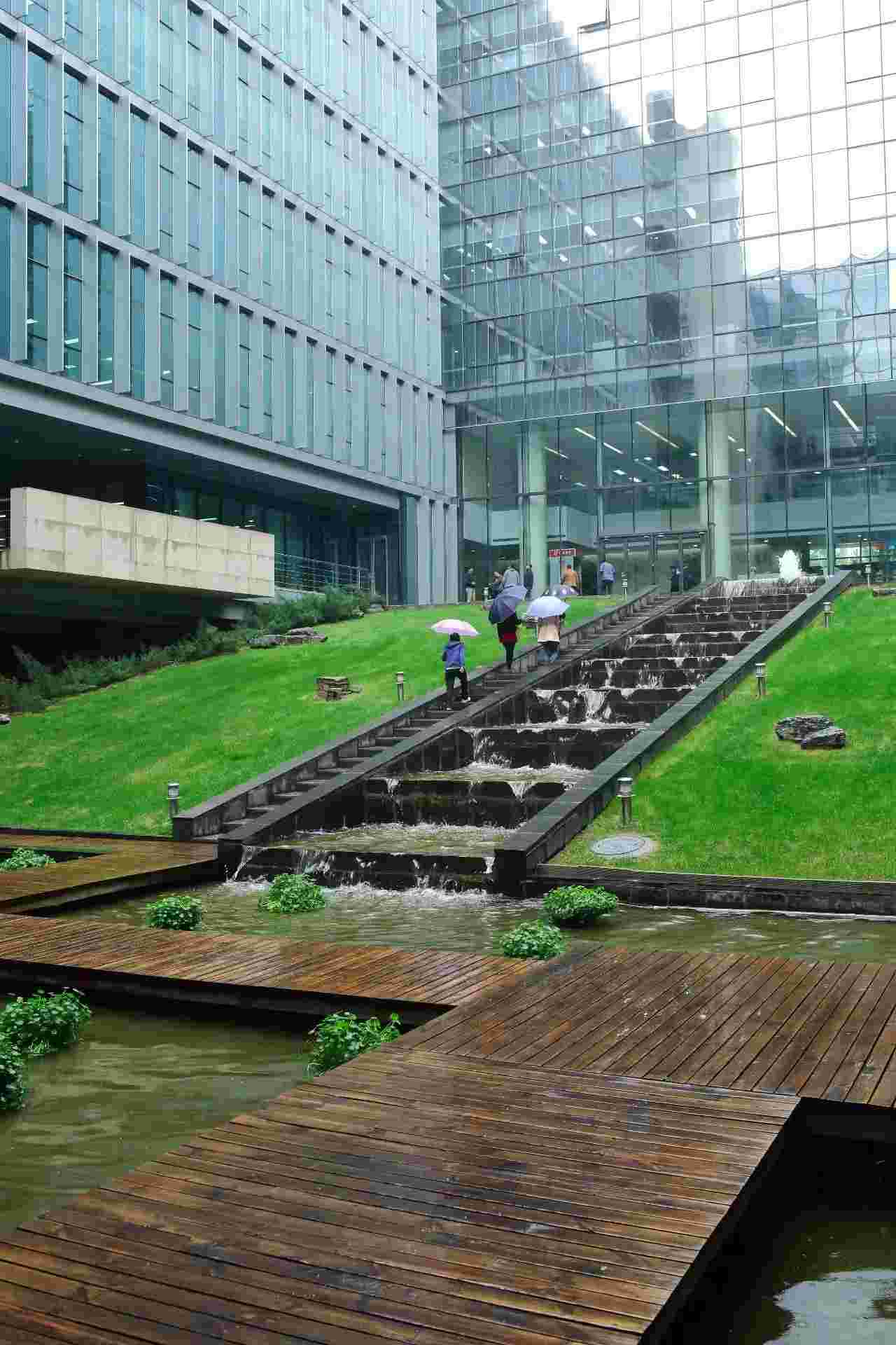 這五棟樓包圍著一個有山有水的花園。負一樓是休閑餐飲區(qū),有不同菜系的中餐廳、西餐廳、面包坊、發(fā)型屋、按摩屋等等。樓內(nèi)還有健身房、室內(nèi)攀巖館等。工作累了的員工可以隨時來休息,換換腦子。