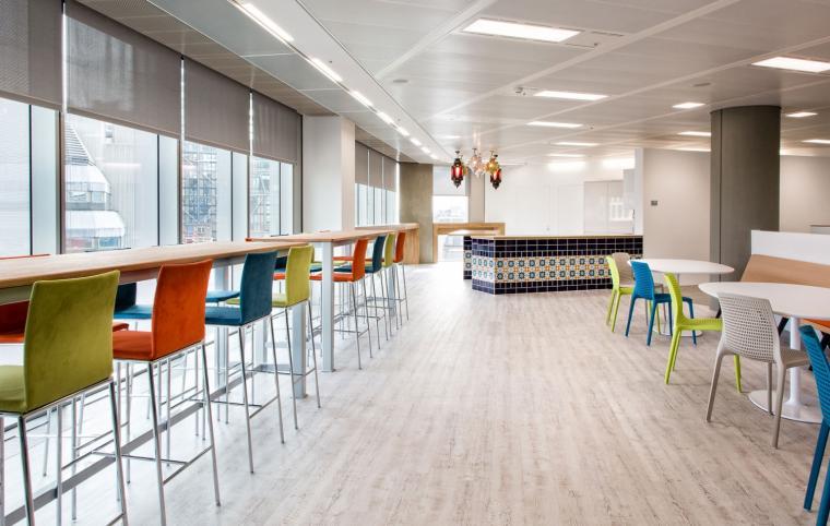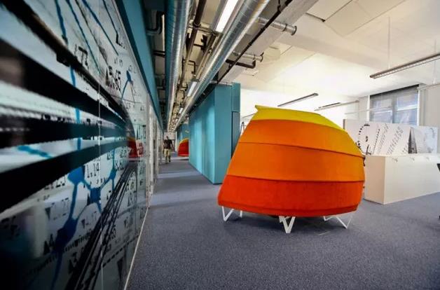 4、國(guó)外某報(bào)紙出版社辦公室裝修設(shè)計(jì)要求現(xiàn)代,新潮。開放式的空間和透明的玻璃使室內(nèi)都變得通透起來,幾何或數(shù)字的涂鴉,充滿個(gè)性又兼具激勵(lì)員工,藍(lán)色和橙色的漸變十分的搶眼!