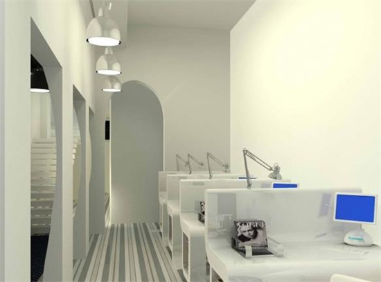 2000平方辦公室裝潢以彩色玻璃隔斷的顏色分出四個會議區(qū)域,紅黃藍綠。每個區(qū)域中的顏色又都有十幾種微妙的變化,共計54種彩色玻璃的顏色,在環(huán)形走廊上完成色彩的循環(huán)。在墻面上,設計師用白色瓷磚做辦公空間內環(huán)形走道的墻面。利用材料的反射性能,彩色光暈在空間中能流動起來。像水彩在紙上洇開一樣,形成氤氳彌漫的效果。同時,考慮到辦公空間的進深較大,白色瓷磚能夠反射外部光線,增加室內空間的光亮度。