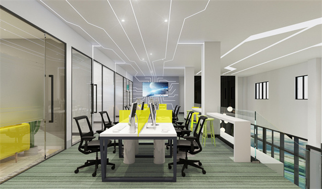 3、550平科技辦公室設(shè)計裝修:空間分成兩層,為了更好的滿足甲方的各種需求,設(shè)計師利用部分硬裝造成一種空間上穿插的效果,達到視野上的開闊性。色彩上面以客戶要求表現(xiàn)活力(綠色調(diào))為主,再以色彩上的搭配,營造出一種賦予有生命力、活力、五彩斑斕的公司。再配以展示電子產(chǎn)品技術(shù)為主題的設(shè)計,達到客戶想要的效果及體驗。